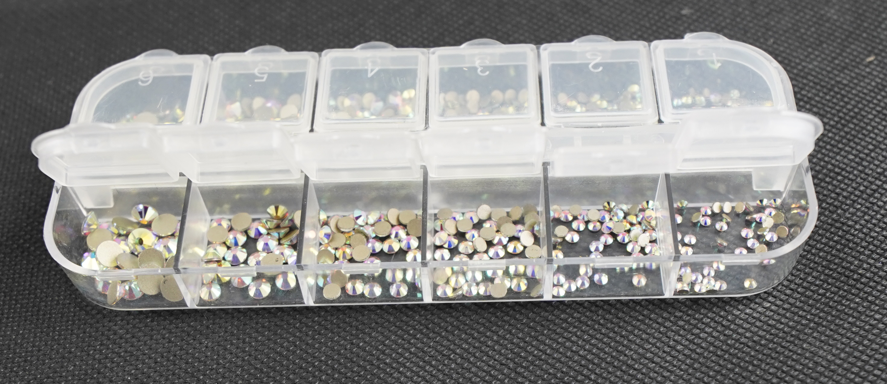 Handliche Strassbox mit irisierneden Strasssteinchen in 5 unterschiedlichen Größen mehr