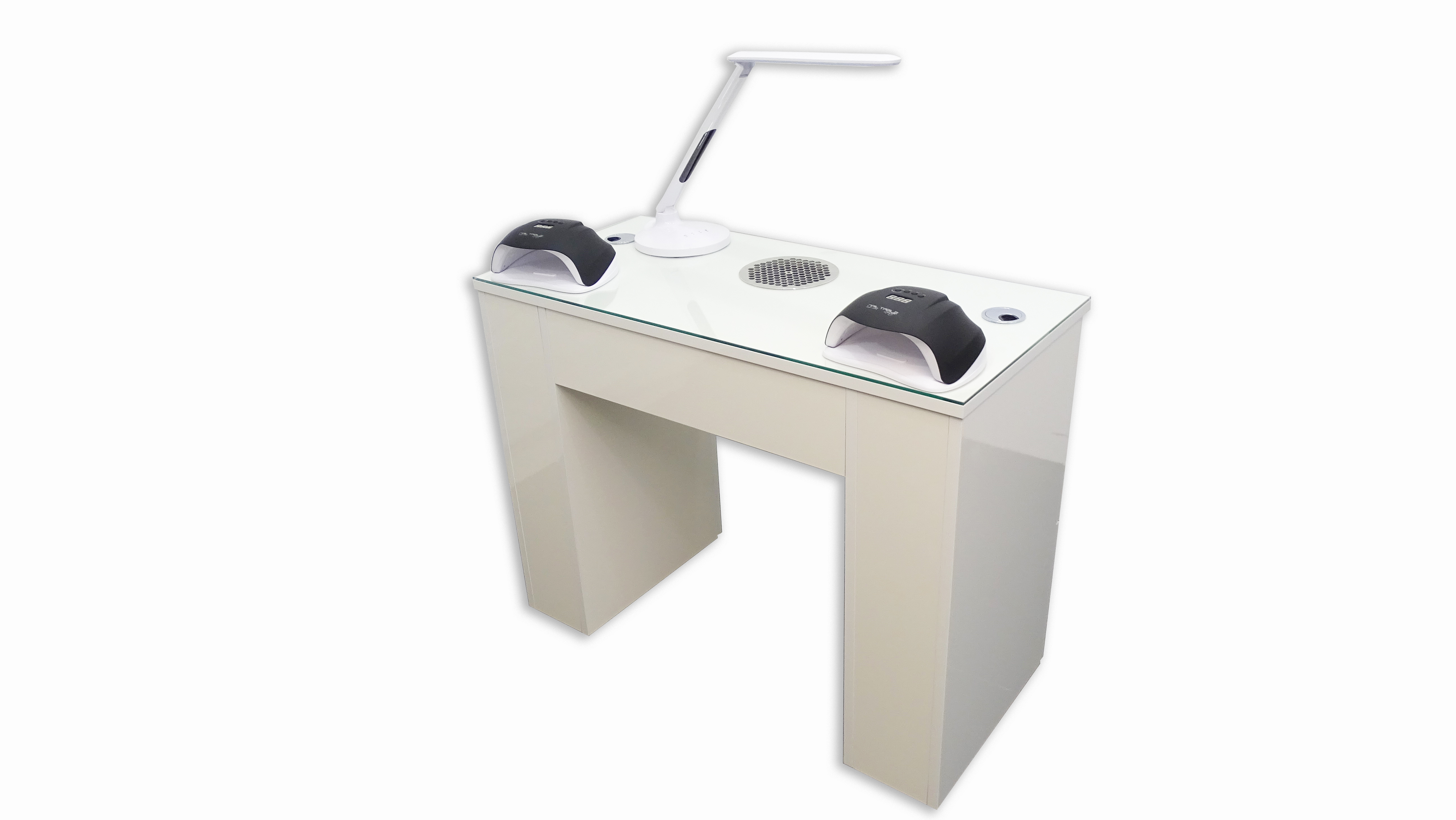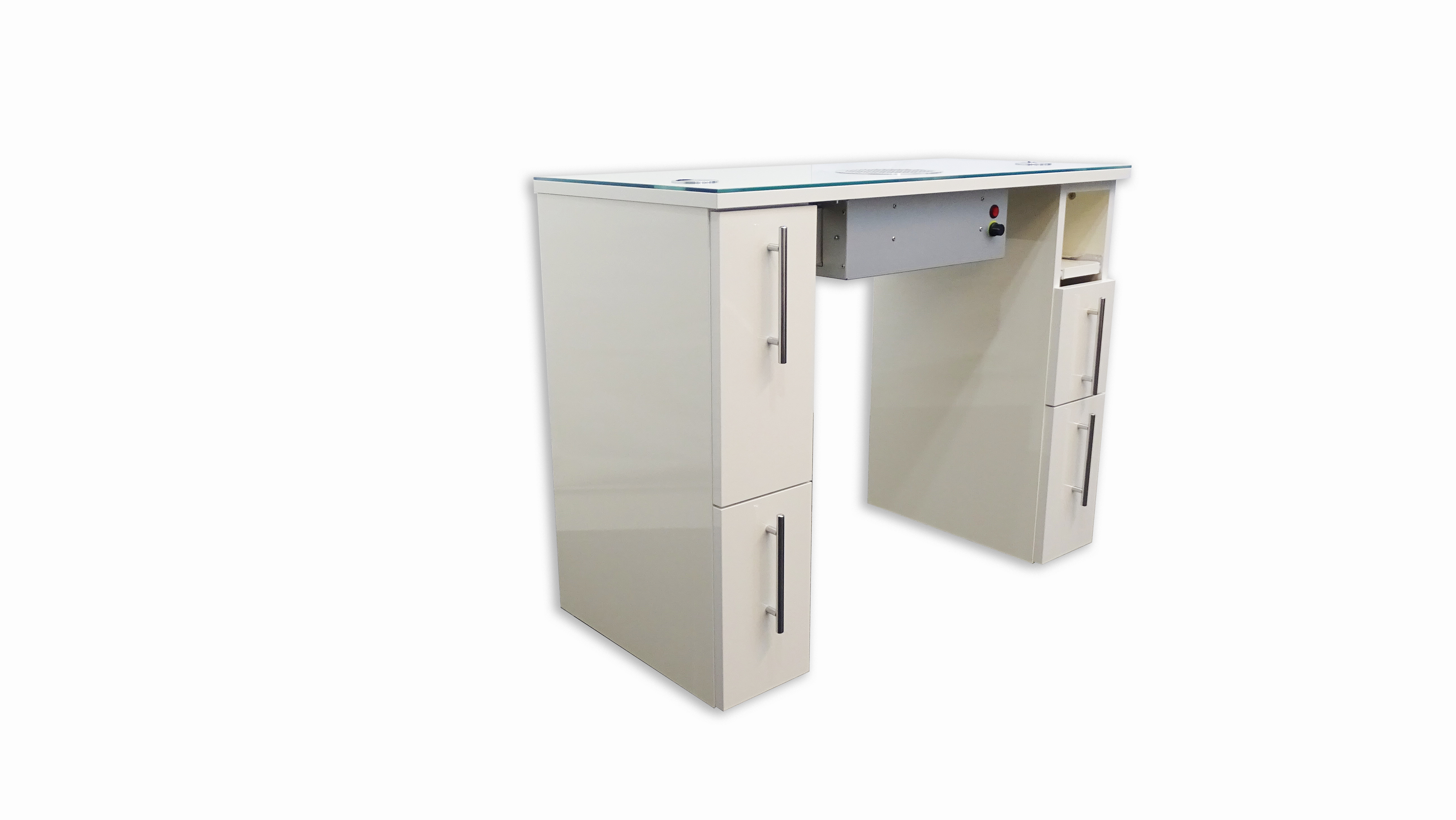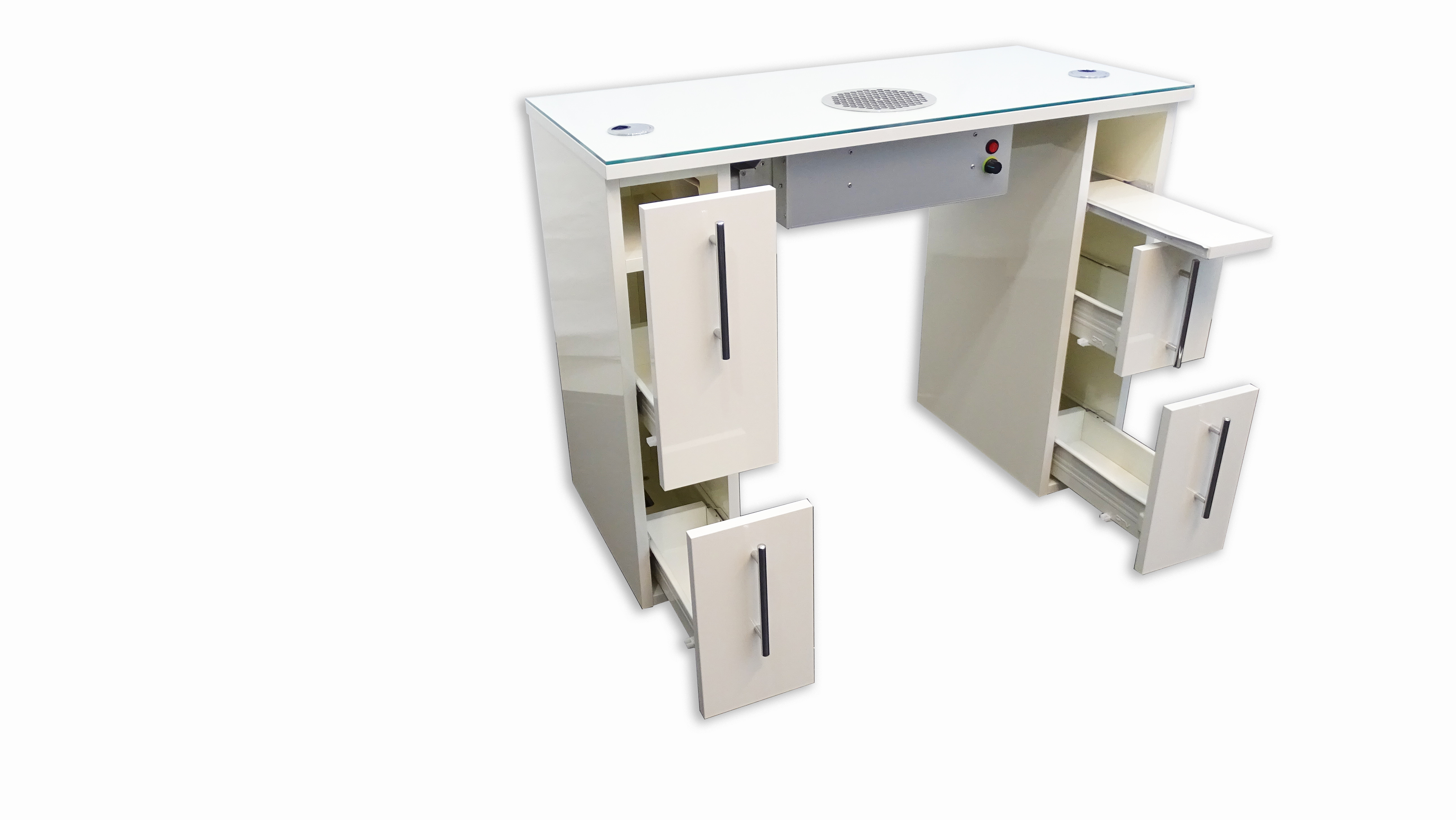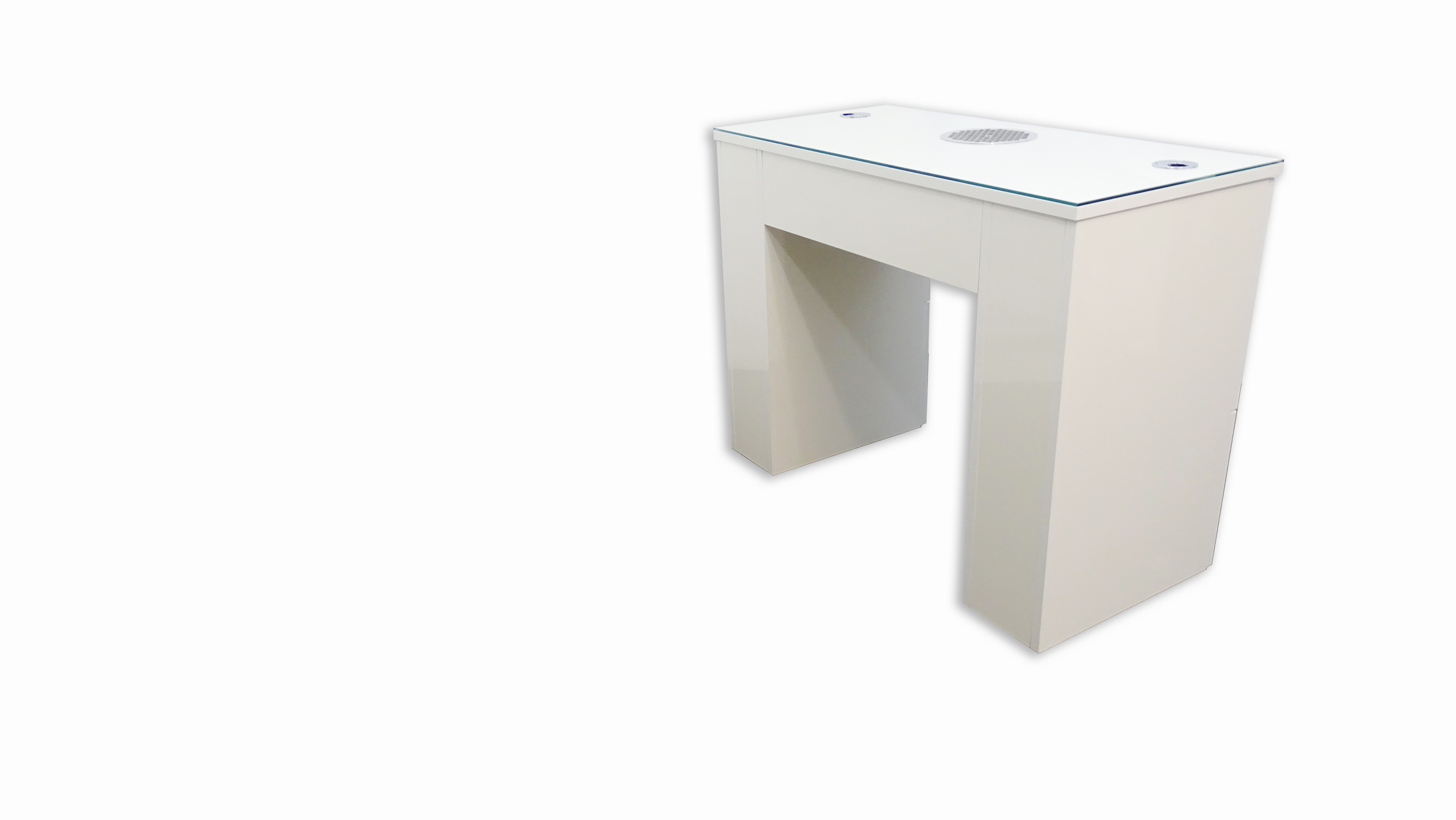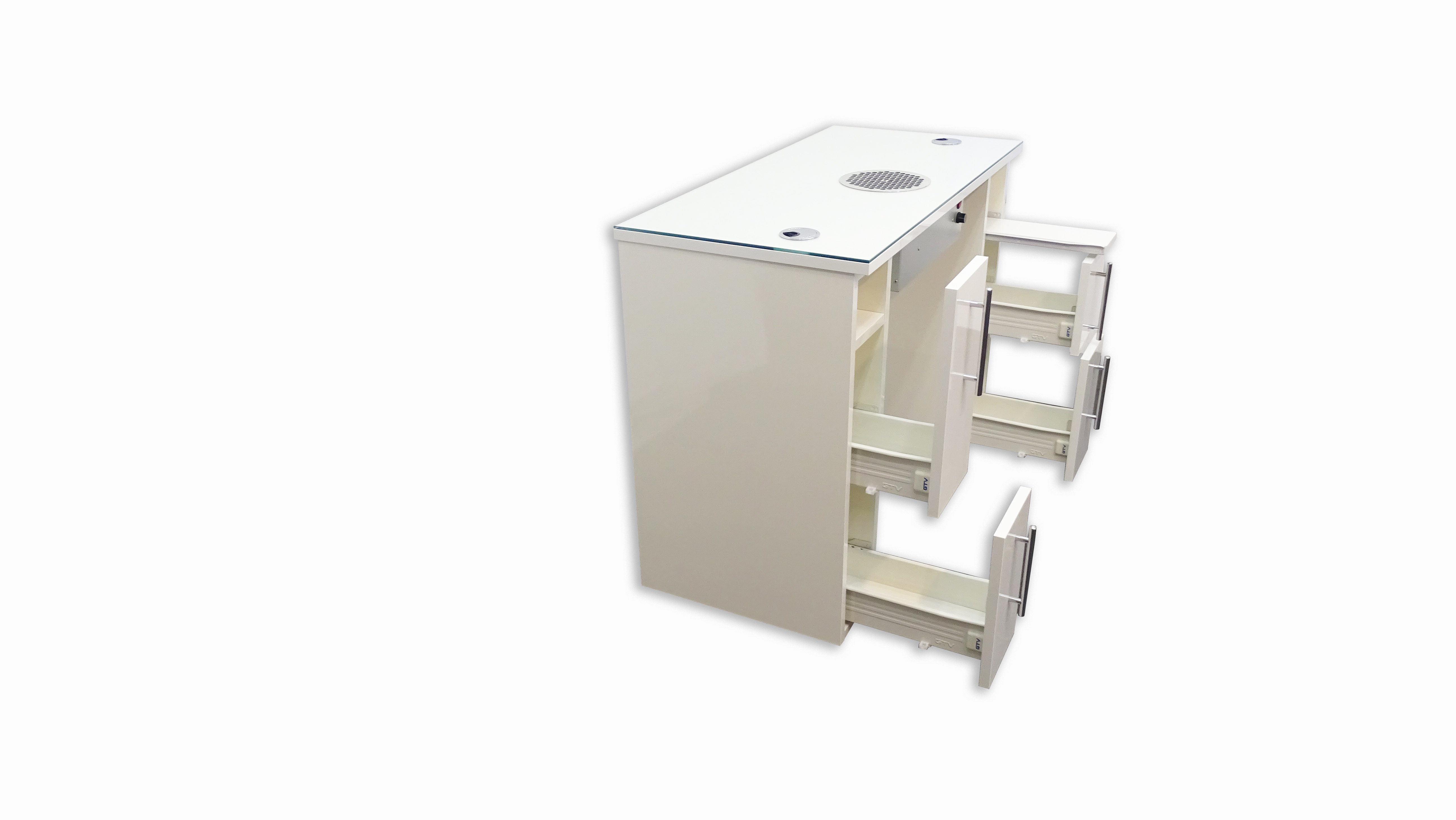 Tischplatte Glas mit Chrom Kabelauslässen Ausfräsung und Grill für Stauabsaugung