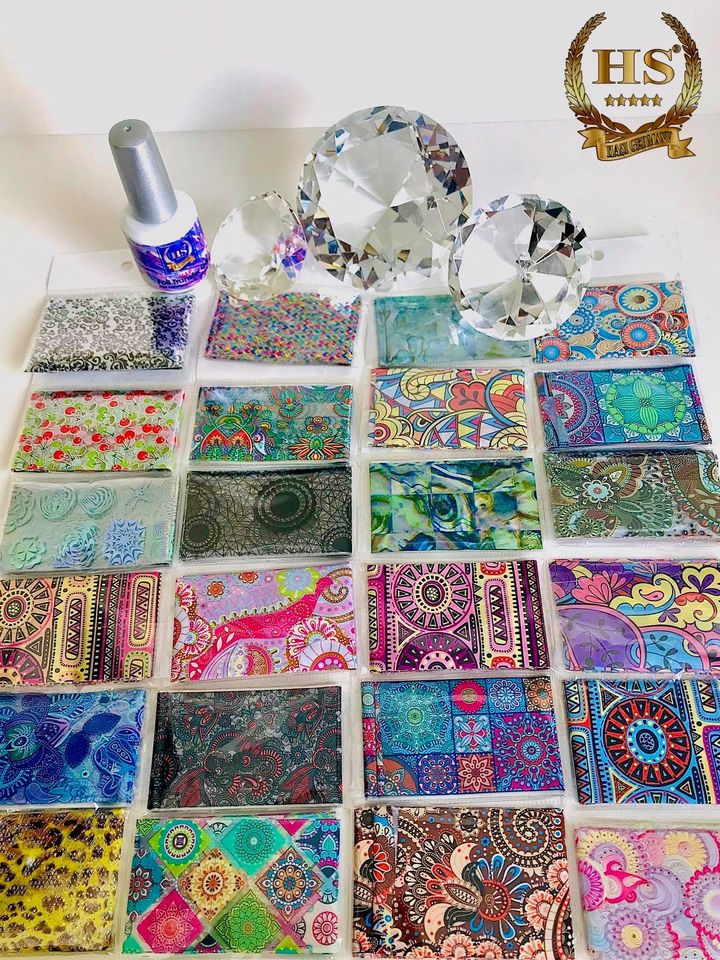 Diese hauchdünnen Folien können vollflächig oder partiell auf den fertigen Nagel aufgebracht werden.