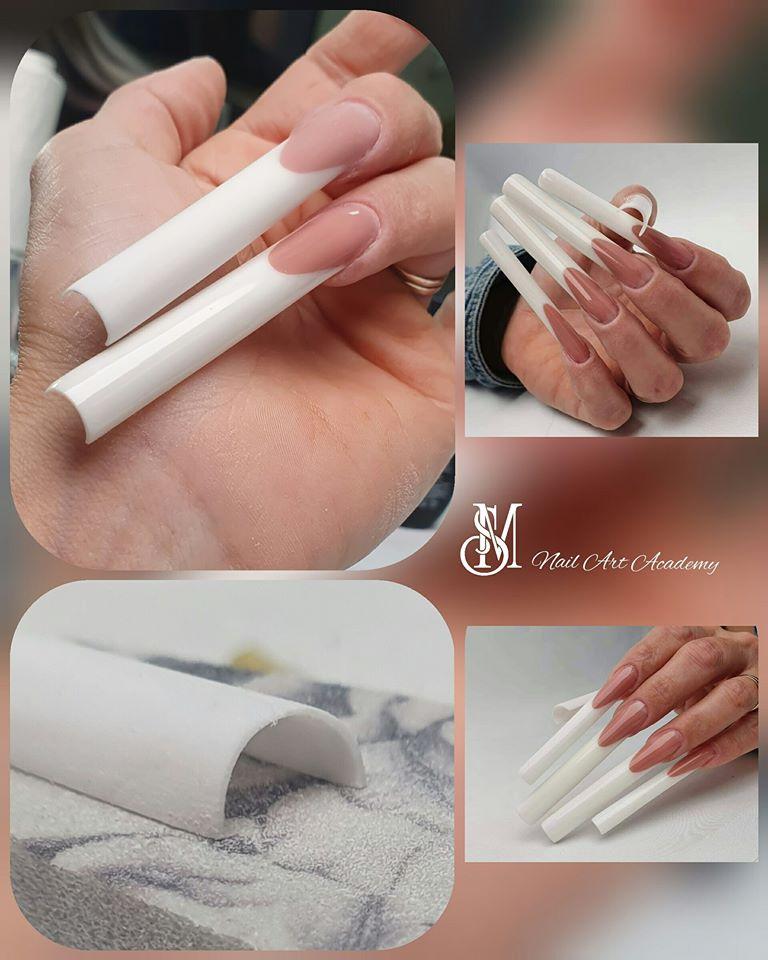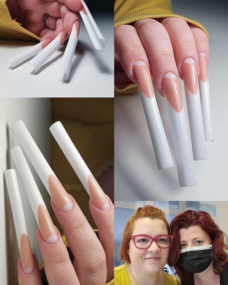 French-Modellage in Acryl oder Gel über Schablone mit modellierter Lunula an 8 Fingern. Eine makellose Nagelhaut ohne Feilstaub, weiße bzw. rote Ränder sowie der Übergang vom Modellageprodukt zum Naturnagel sollten unsichtbar sein. Die Smileline musste als „Dramatic French“ gestylt werden und das Nagelbett mit einem Camouflage-Produkt auf eine Länge von 25 mm verlängert sein. Die Länge der weißen Spitze sollte exakt auf 40 mm modelliert werden. Daraus resultiert eine Gesamtlänge von 65 mm bzw. 6,5 cm. Die Nägel werden in der gesamten Länge auf die gleiche Breite gestylt und der Tunnel muss 50 % von einem Kreis darstellen. Die Hair-Line wird hauchdünn gearbeitet und der gesamte Nagel hat die Form einer Röhre bzw. einer Zigarette. Eine Hand musste rot lackiert werden und die weiße Frenchspitze durfte nicht durch den Nagellack scheinen.